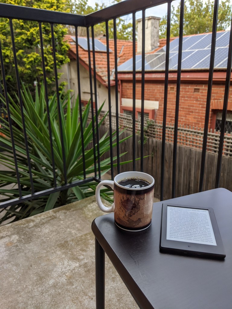 Coffee in a Harry Potter mug, a new book on my Kindle, and a little fresh air from the balcony.